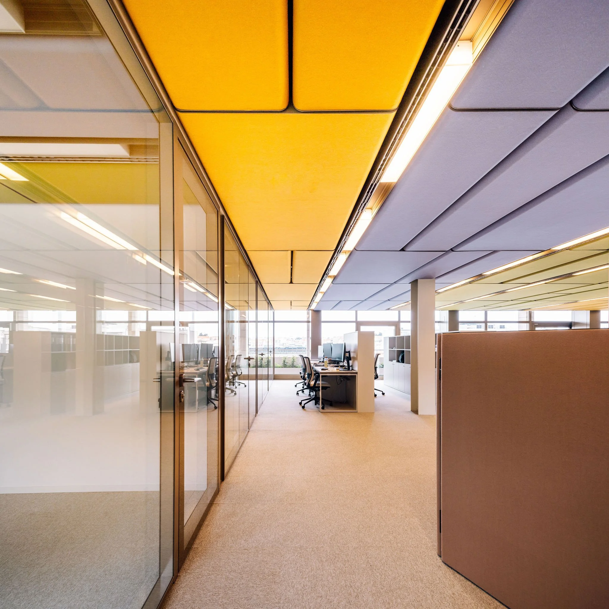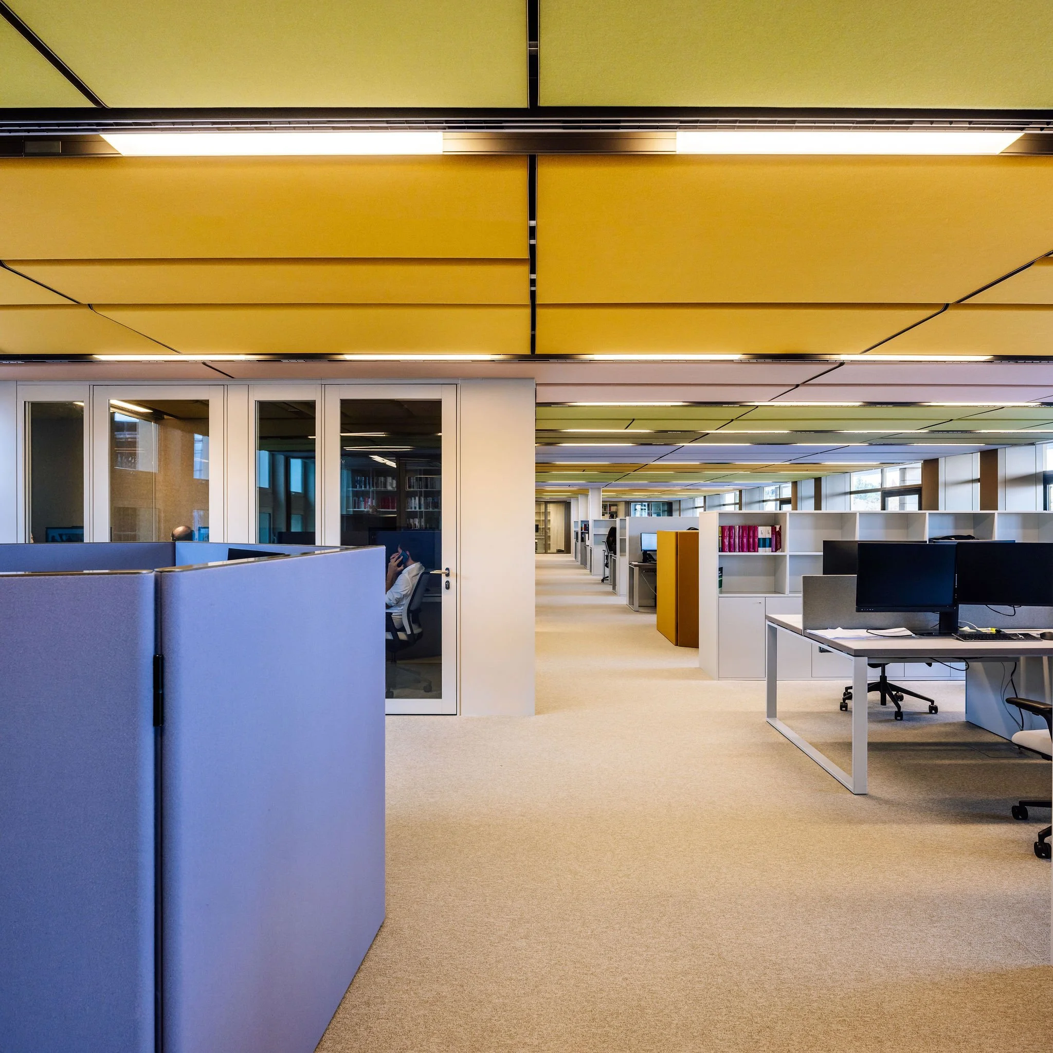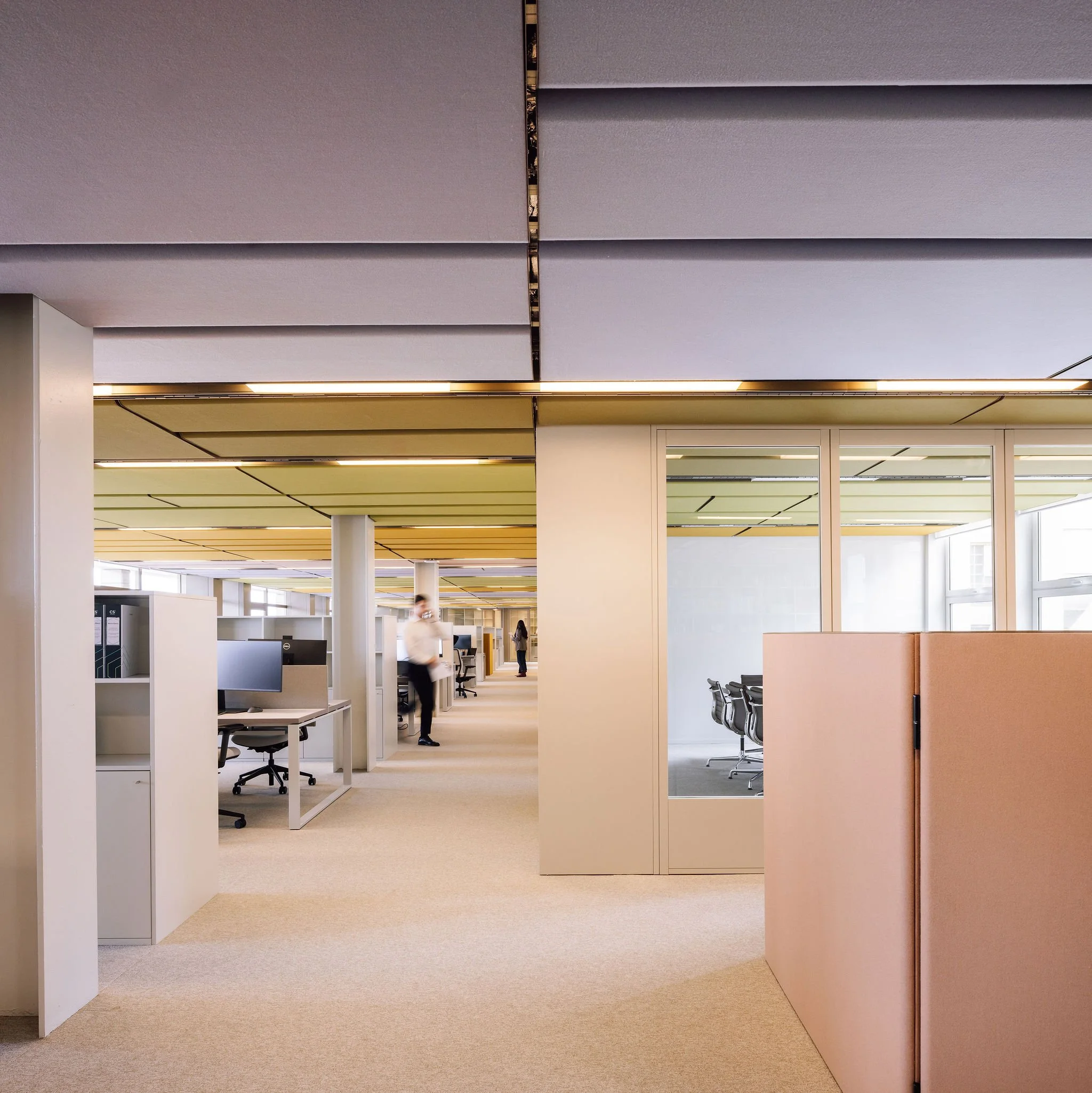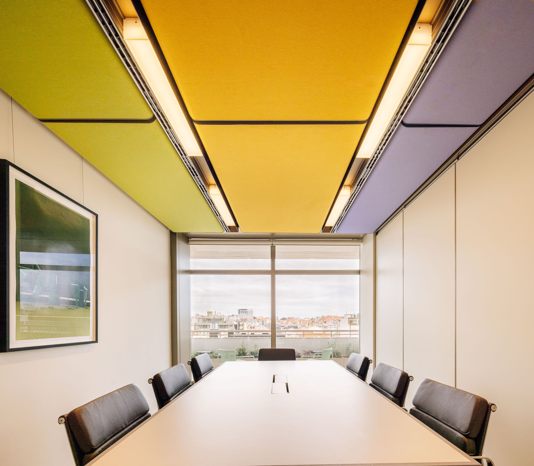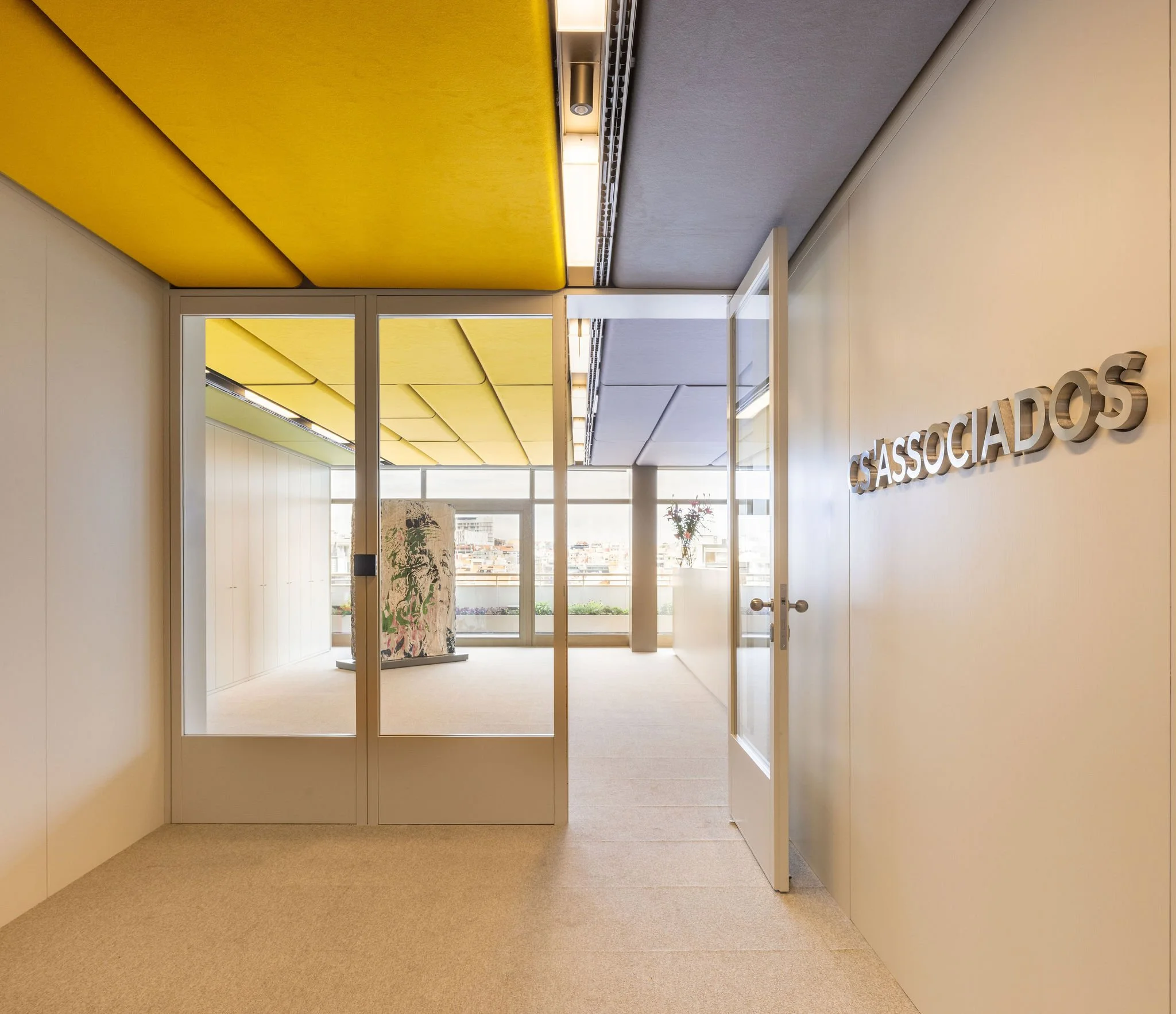 En la nueva oficina de CS’Advogados en Lisboa, construida por Huître y diseñada por el estudio Bak Gordon Arquitectos, las soluciones de BAMER contribuyeron a materializar un proyecto único de 1.300 m², distribuido por las plantas 7 y 8 del edificio 249, en la Avenida da Liberdade. BAMER suministró las mamparas y carpinterías, pero también el techo especial, el verdadero elemento icónico del espacio. Compuesto por 700 paneles de alta precisión constructiva, revestidos en tela de burel en cinco tonos contemporáneos, el techo aporta identidad, textura y sofisticación a todo el entorno de trabajo.