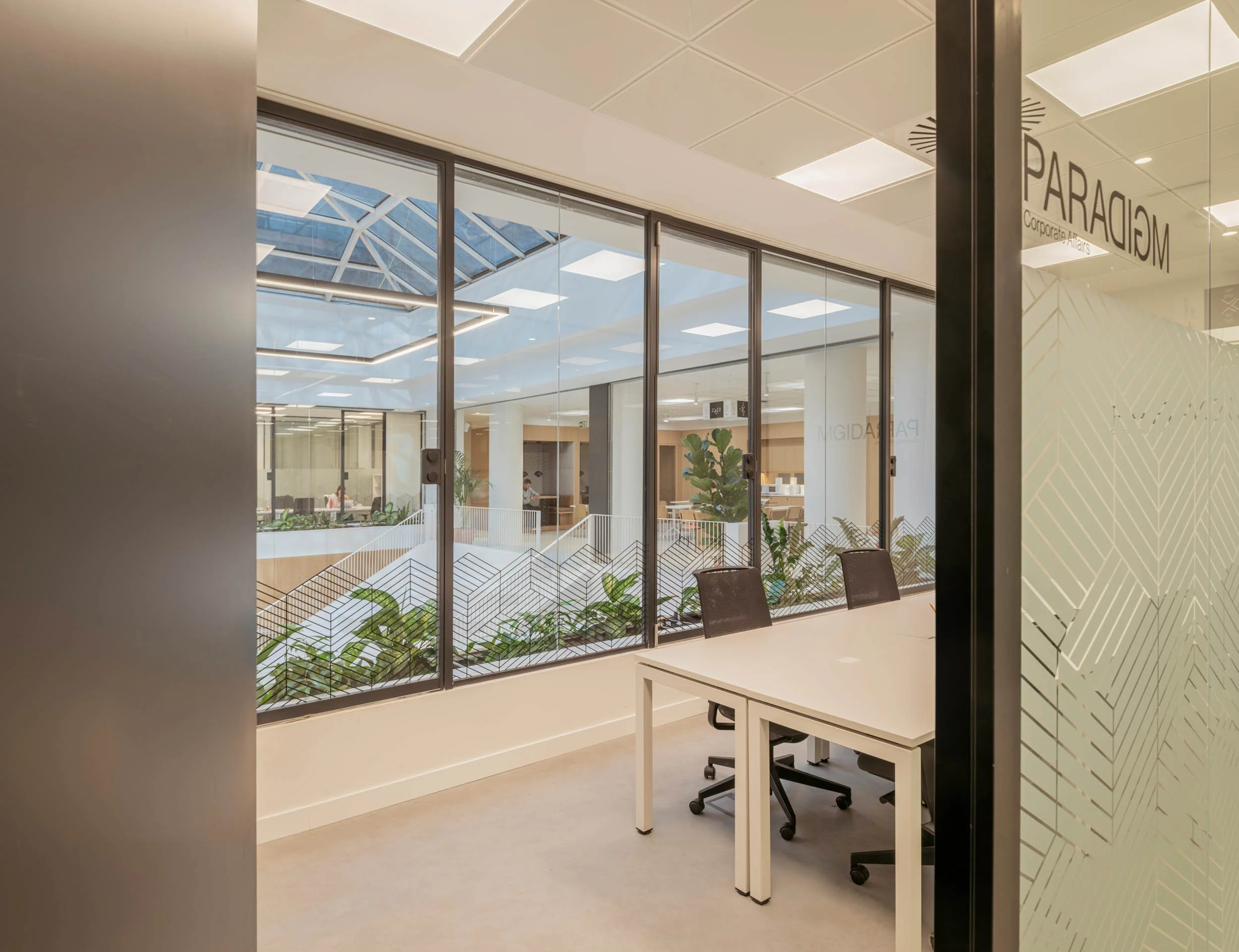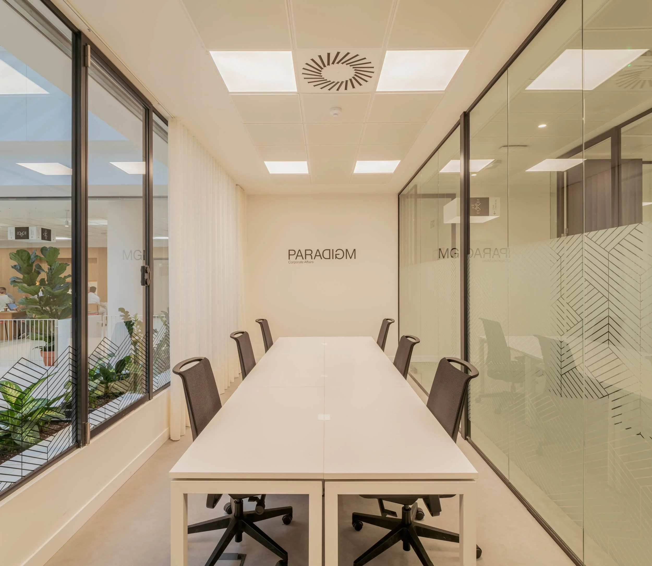 Las mamparas R66, con perfilería negra, permitieron configurar áreas de trabajo y reunión que suman 2.500 m², incorporando puertas ciegas y puertas de vidrio. El resultado es un entorno contemporáneo, funcional y visualmente sofisticado, alineado con las exigencias de un espacio de trabajo de última generación.